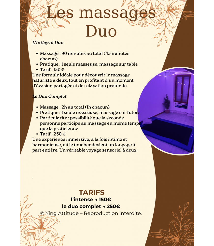 Les massages Duo proposés par Ying Attitude sont des massages bien-être non sexuels.