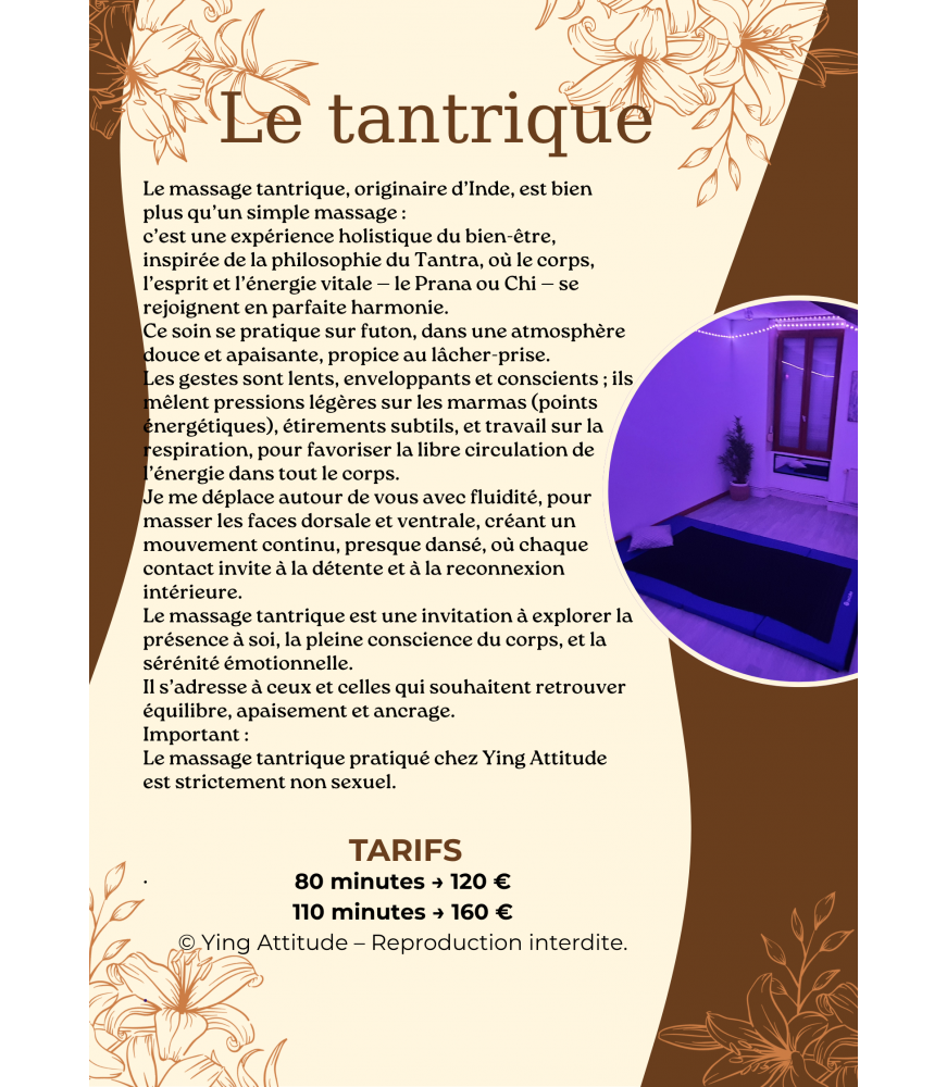 Bien que profondément sensoriel et porteur d’émotions, le massage tantrique proposé chez Ying Attitude est strictement non sexuel.