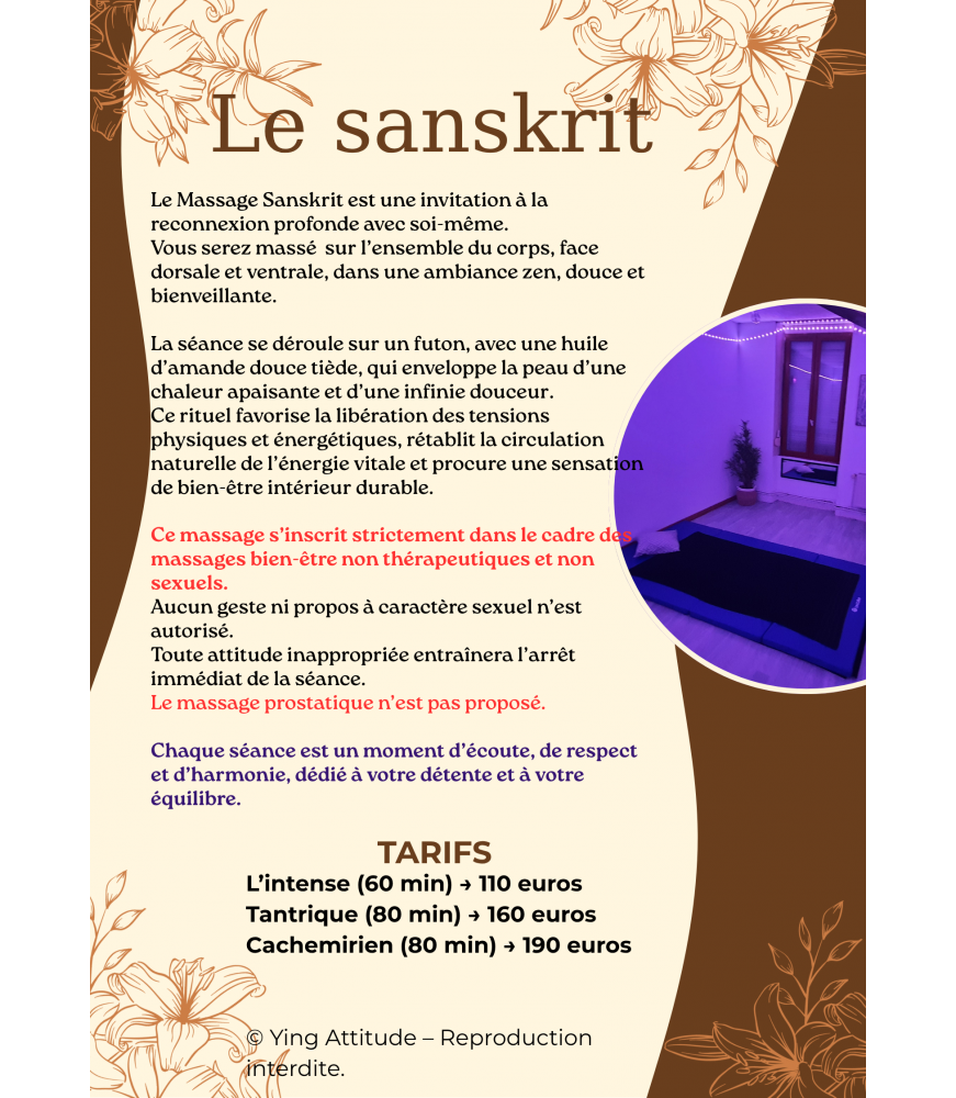 Le Massage Sanskrit s’inscrit strictement dans le cadre des massages bien-être non thérapeutiques et non sexuels.