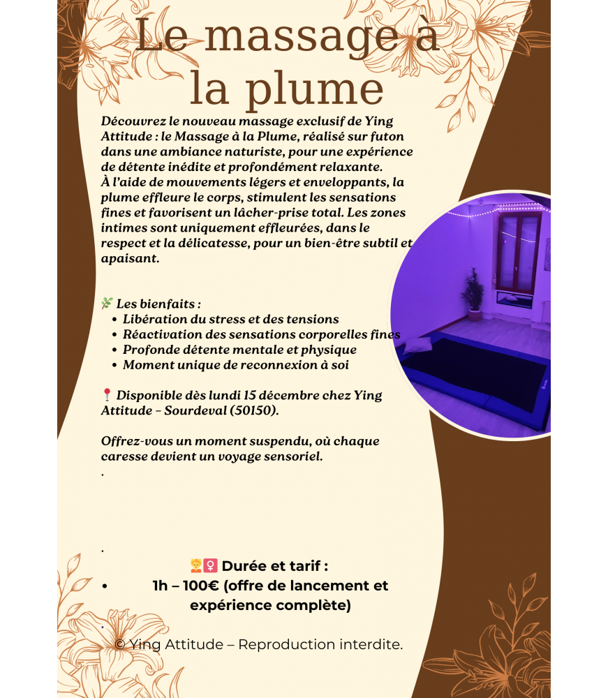 Un massage unique sur futon et en naturiste, où chaque effleurement de plume procure un lâcher-prise total, libère le stress et offre un moment de détente profonde. Les zones intimes sont uniquement effleurées, dans le respect et la douceur.